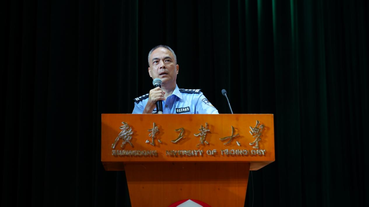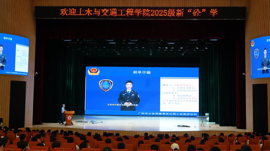 在大学城校区文化活动中心演艺厅举办2025级新生安全防诈专题讲座。番禺区分局小谷围派出所民警陈林群应邀作主题分享。学院党委副书记陈颂坚、2025级辅导员及600余名新生参加。