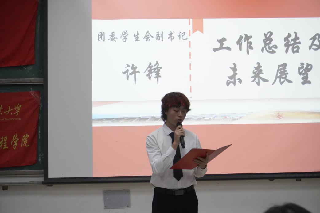 随后,团委学生会学生兼职副书记许锋同学对上一年度工作作了系统总结,全面回顾了组织在制度建设、学风建设、文体活动及志愿服务等方面取得的成果。他结合“服务+创新”的双主线,详细介绍了新学年的工作思路与重点任务,强调将持续深化组织改革,不断提升服务效能。
