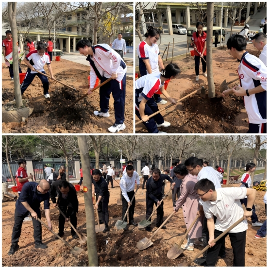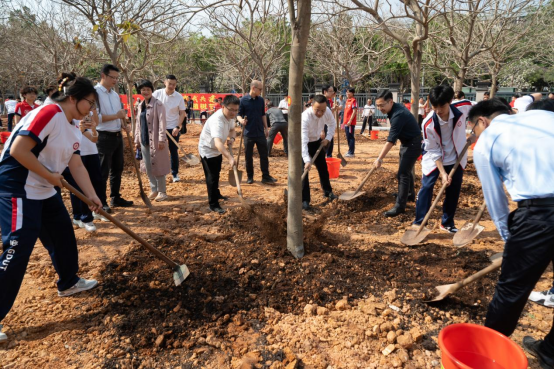 在植树现场,校友们与学院领导、在校学生一起,挥锹铲土、扶苗填坑、浇水灌溉,大家分工协作,干劲十足,现场一片热火朝天的景象。经过一番辛勤劳动,一棵棵新栽的树苗昂然挺立,在春风中展现出勃勃生机,为校园增添了一道亮丽的风景线。