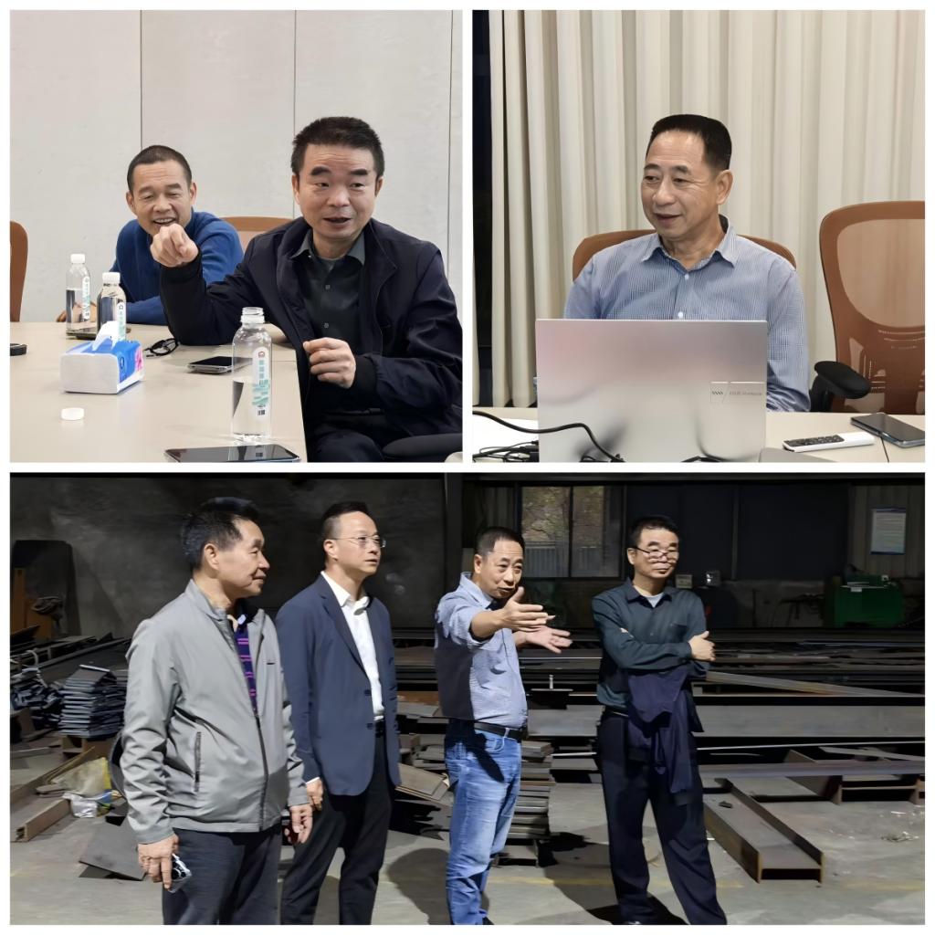 在南翔钢结构工程有限公司,周建强一行与校友们亲切交流。南翔钢构总经理许耿群校友详细介绍了企业的发展历程,重点展示了其自主研发的模块化建筑体系和自动化生产线。