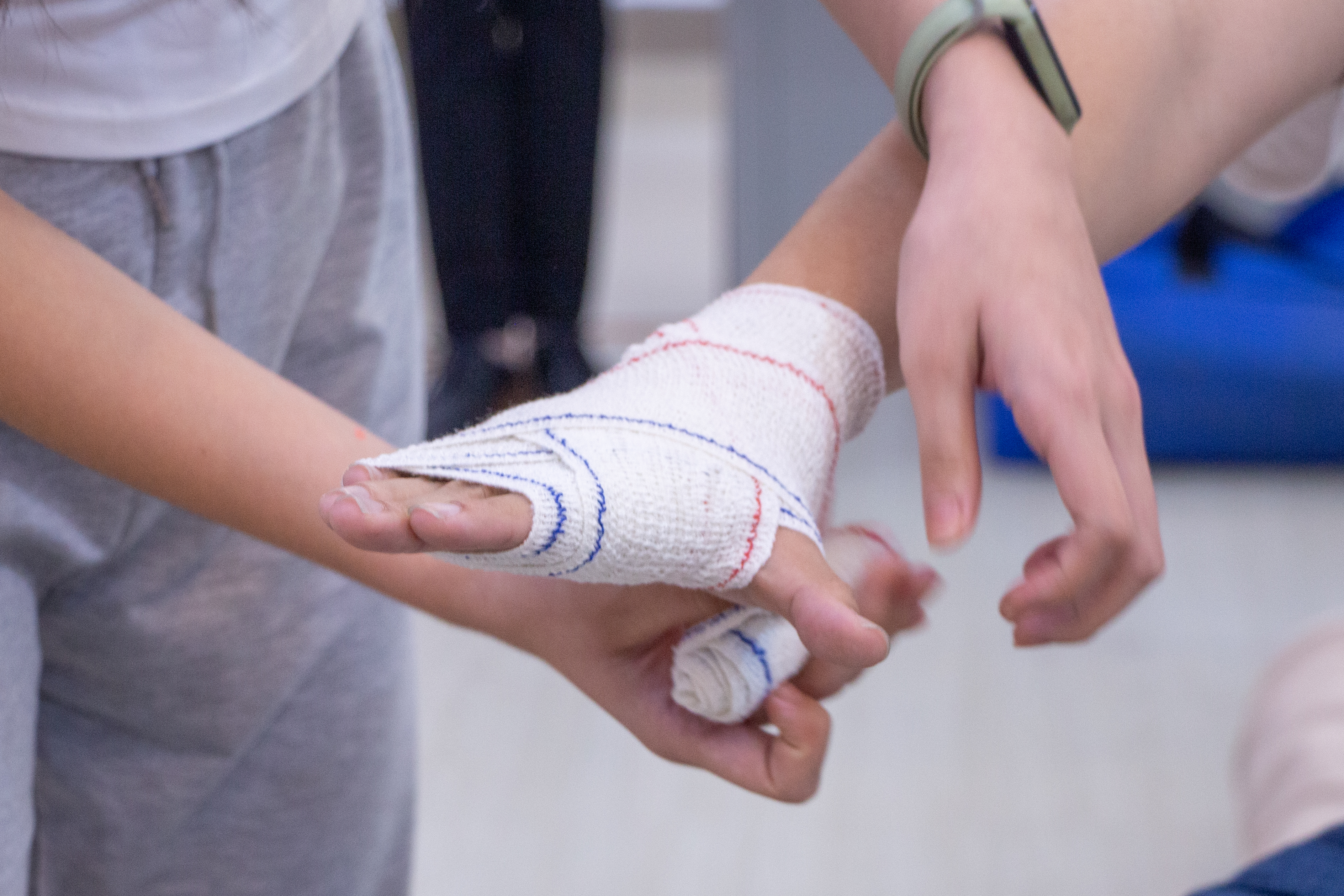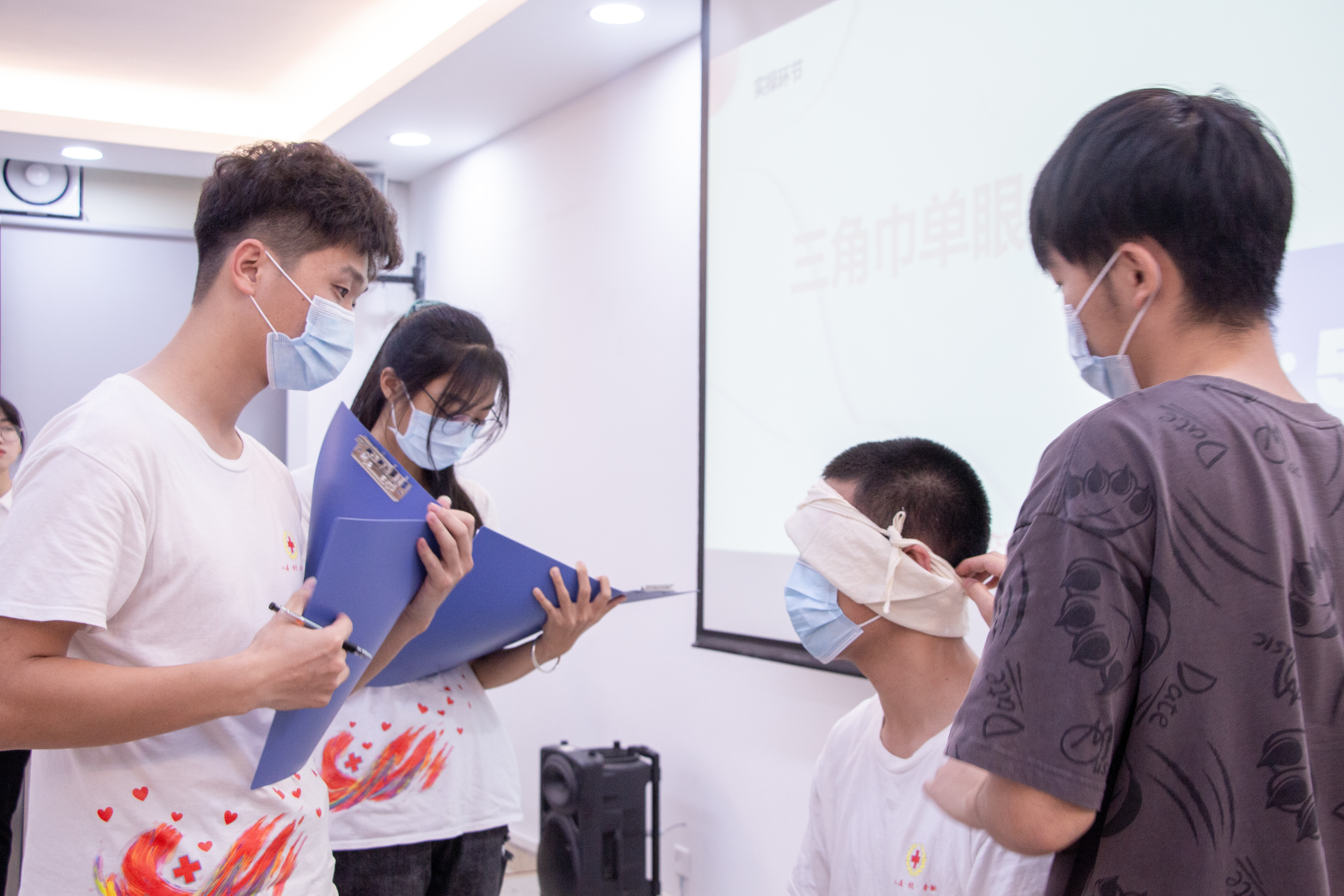 本次竞赛还加强了同学们的实操能力。在实操环节中,每支队伍轮流上台进行实操,一人讲解,其余队员进行演示。多支队伍向我们演示了如何进行CPR心脏复苏的同时,还分别展示了“三角巾单眼包扎法”、“三角巾双眼包扎法”、“三角巾手部包扎法”等包扎方法。负责讲解的选手耐心且细致地为大家讲解每一个动作的规范和要领,选手们展现出了各自的风采,包扎技能娴熟,实力旗鼓相当。观众们也受益匪浅。