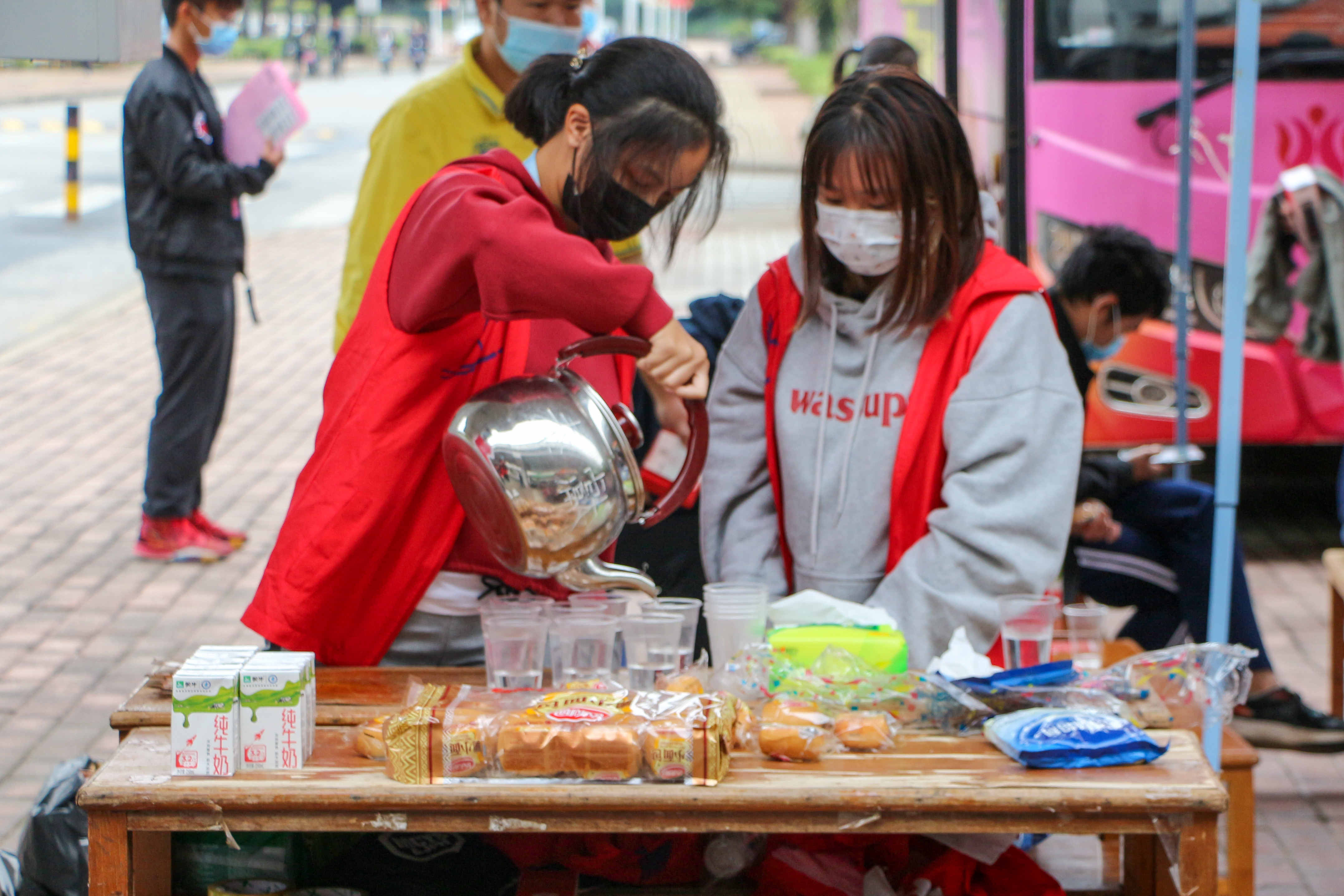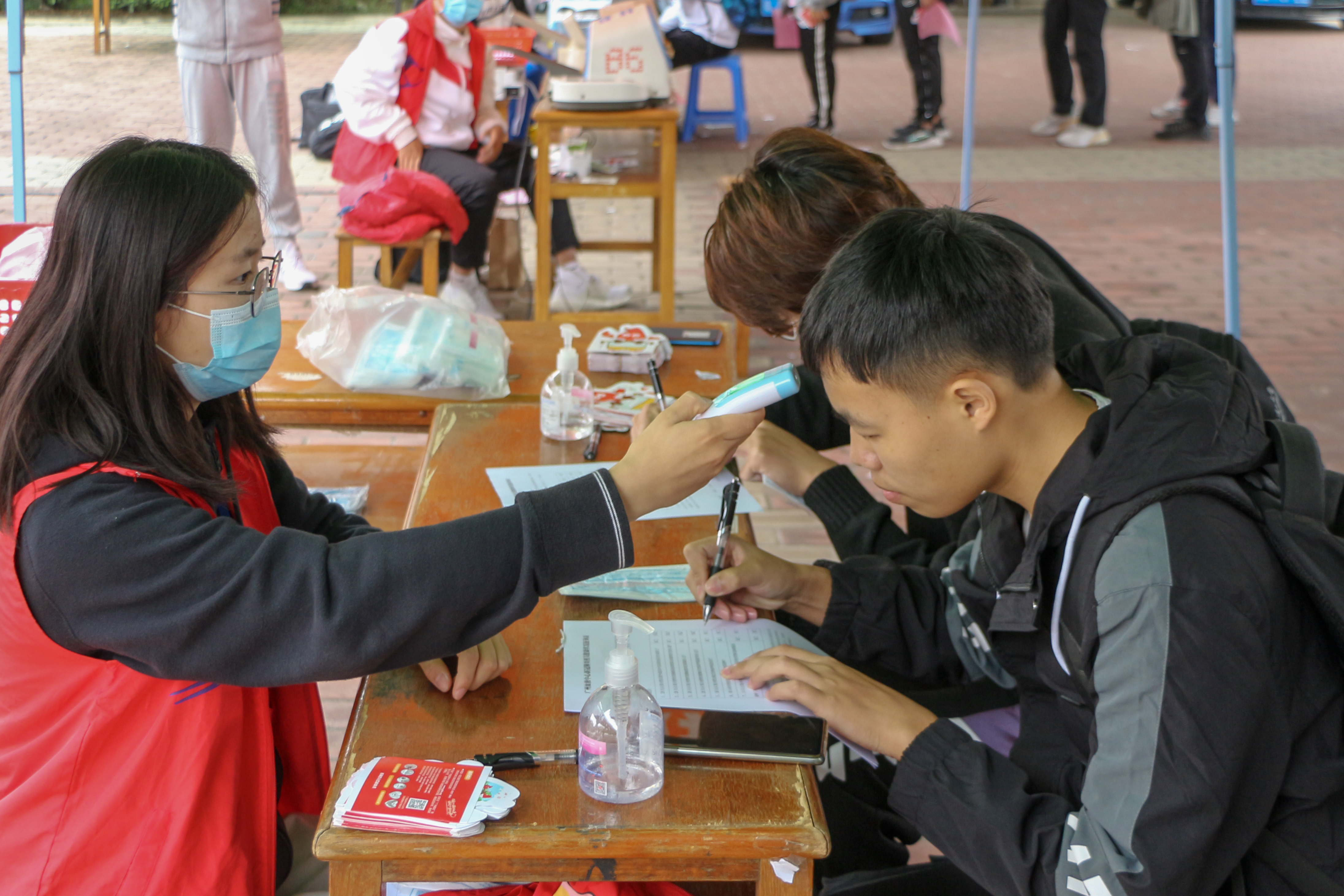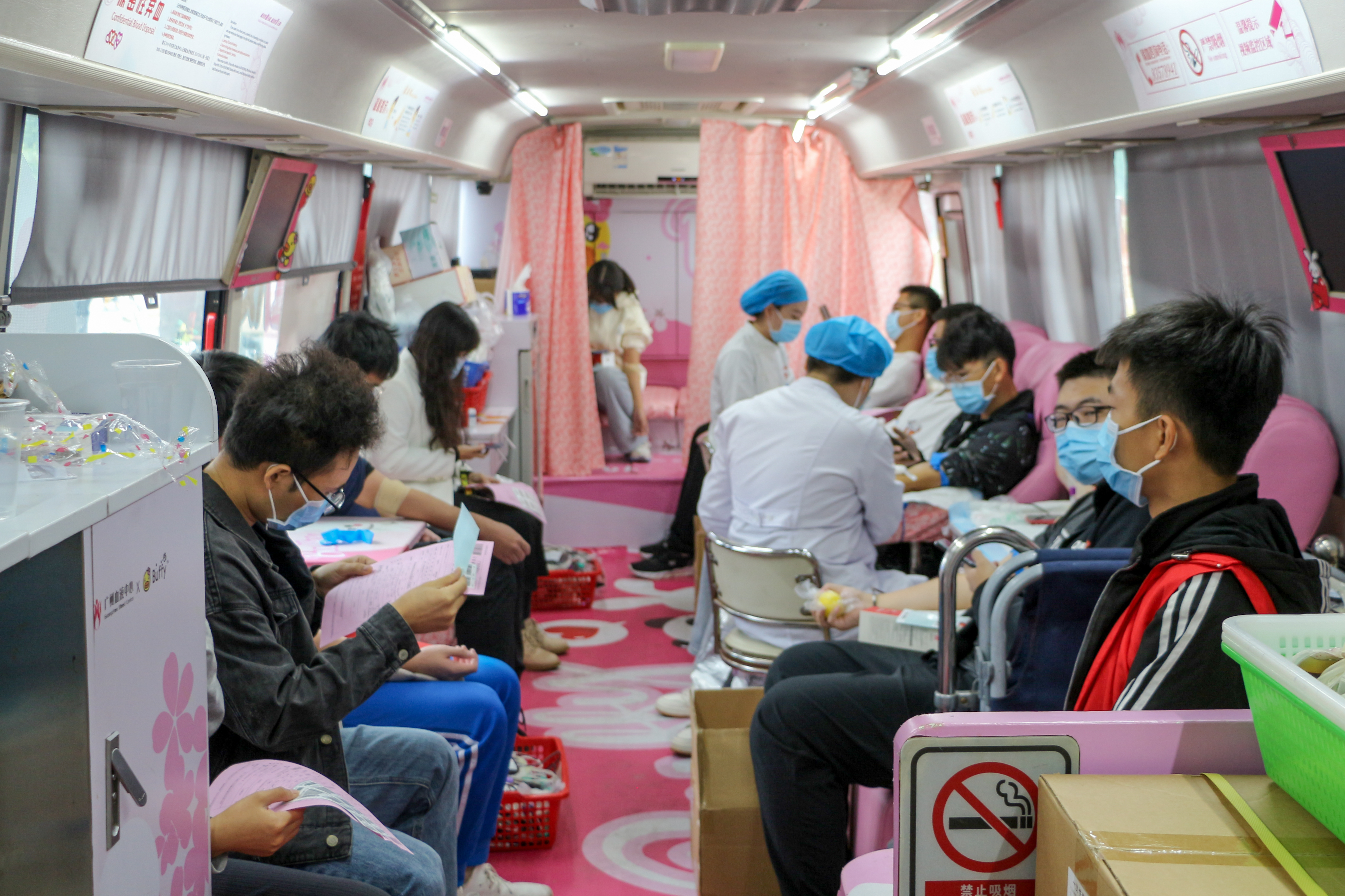 活动当天,红会志愿者们早早地来到献血地点开始布置场地。上午八点半,随着广州血液中心的采血车抵达献血点,献血活动正式开始。同学们积极参与本次活动,耐心且有序地排队等待献血。红会志愿者们向同学们介绍了献血注意事项,指引献血者们排队和登记,为正在等待献血的同学们提供葡萄糖水、牛奶、蛋糕、热水等补给。在同学们献完血后,红会志愿者们为其发放保温杯纪念品,同时,向十八岁的献血者发放“18周岁献血”纪念章。