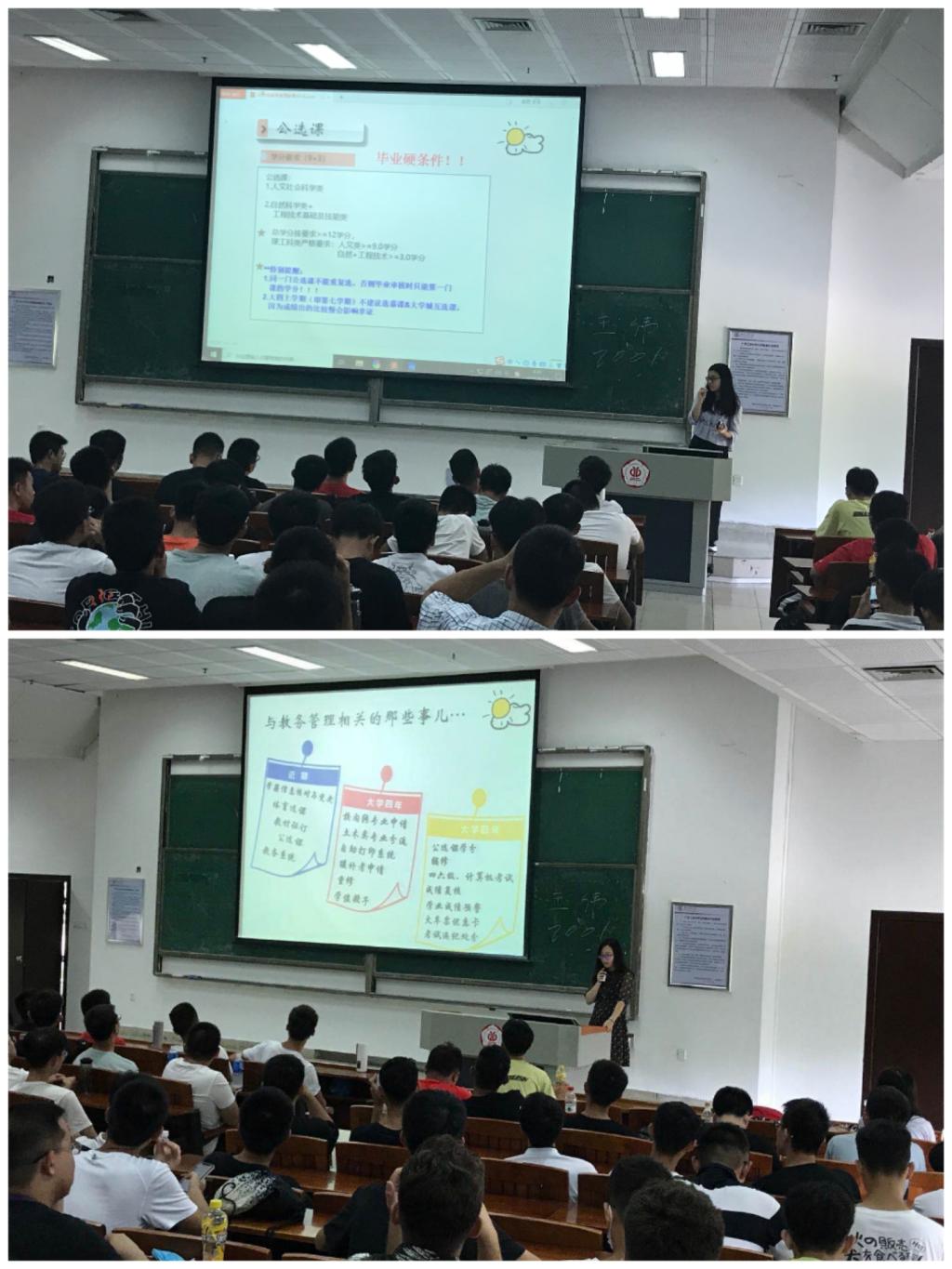 9月18日上午,新生辅导员李成瑶老师和谢泽涛老师向同学们介绍了学校、学院学生管理与服务工作,重点介绍了与同学们紧密相关的职能部门和管理服务信息系统。随后,教务员胡鸿颖老师和陈子晴老师也向同学们介绍了包括选课、学籍信息、双学位、双专业、辅修、转专业、缓考、补考、考试违纪等日常管理与服务事务。
