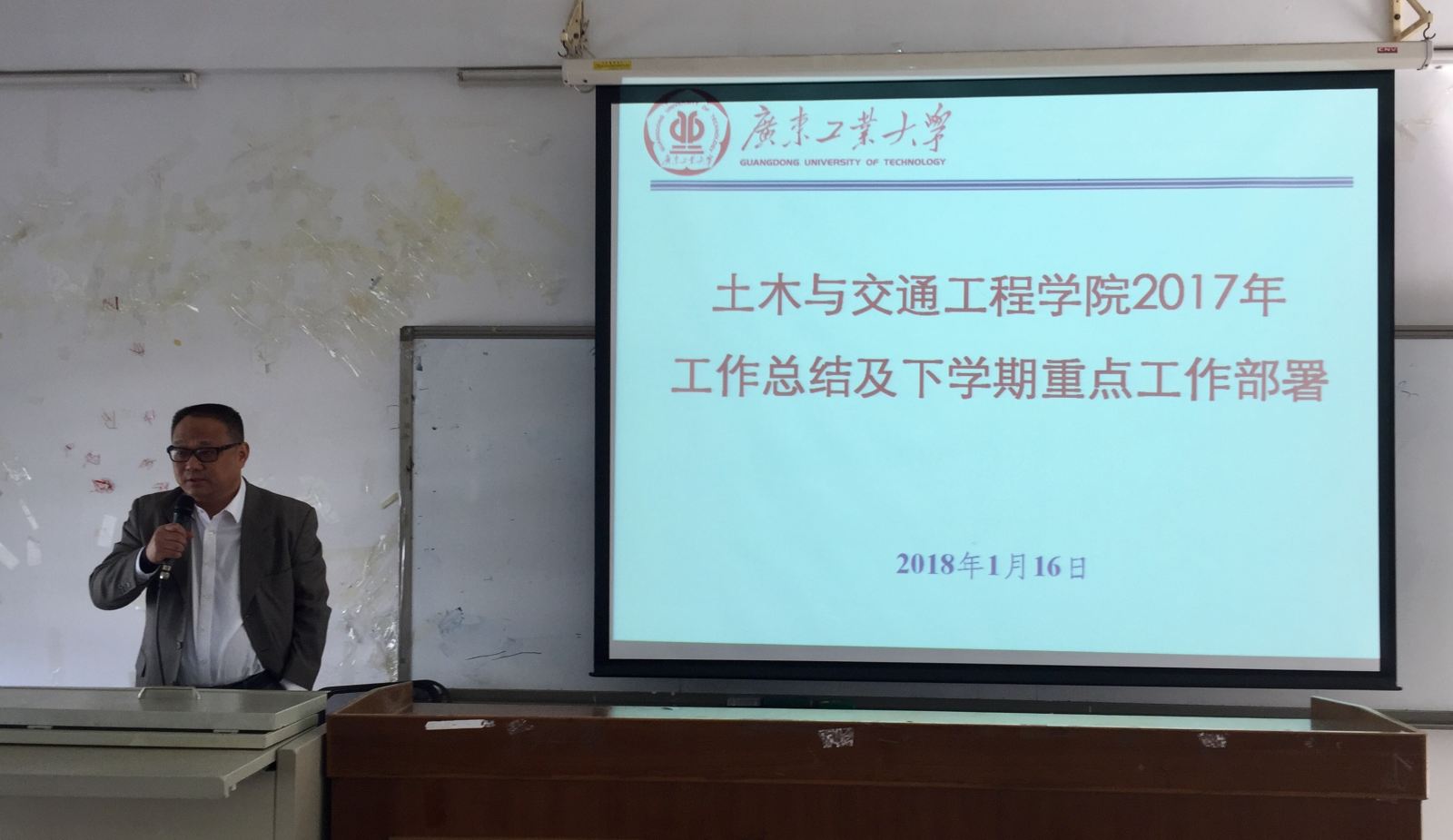 院长刘锋做学院2017年工作总结及下学期重点工作部署。刘院长从党建和学生工作、教学与人才培养、科研与外事工作、学科建设与人才引进、实验室建设等五个方面总结了一年来学院的各项工作进展与成绩亮点,他希望全体教职工凝心聚力,在下学期重点做好建筑环境与能源应用工程专业评估准备工作、土木工程专业评估复评准备工作、测绘工程专业认证申请工作、国家自然科学基金申报推进工作、实验室与实验设备管理工作、本科专业招生宣传工作、迎接学校60周年校庆准备工作等。最后,刘院长引述习近平总书记在新年贺词中的原话:“九层之台,起于累土。要把蓝图变为现实,必须不驰于空想、不骛于虚声,一步一个脚印,踏踏实实干好工作”,鼓励全体教职工要实干创新,奋斗不息,服务好学院、学校的发展大局与高水平大学建设事业。