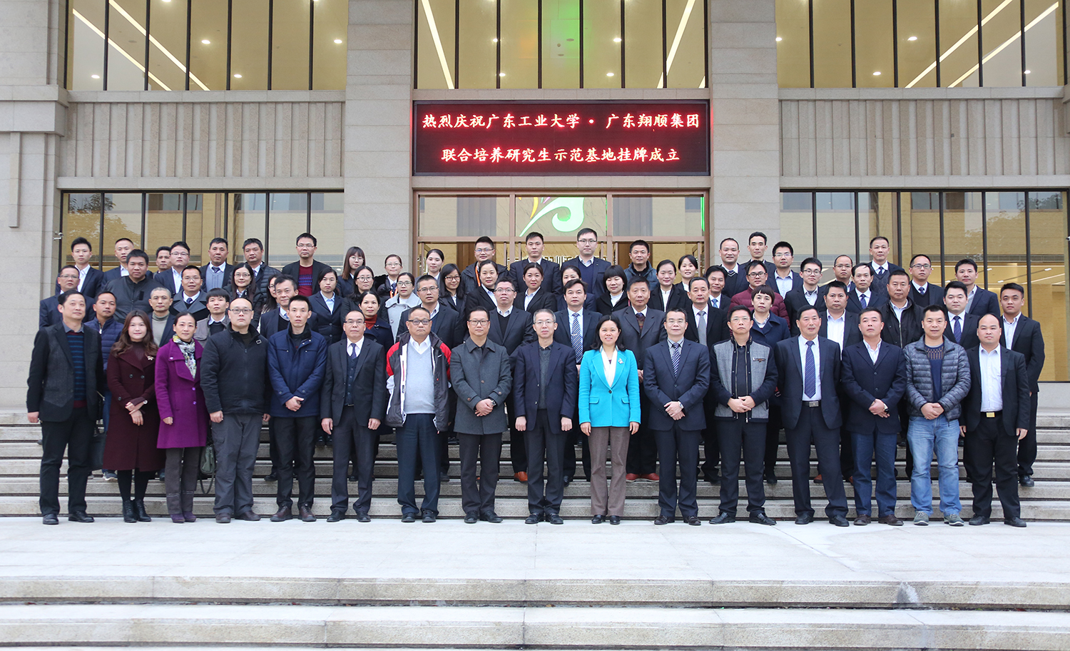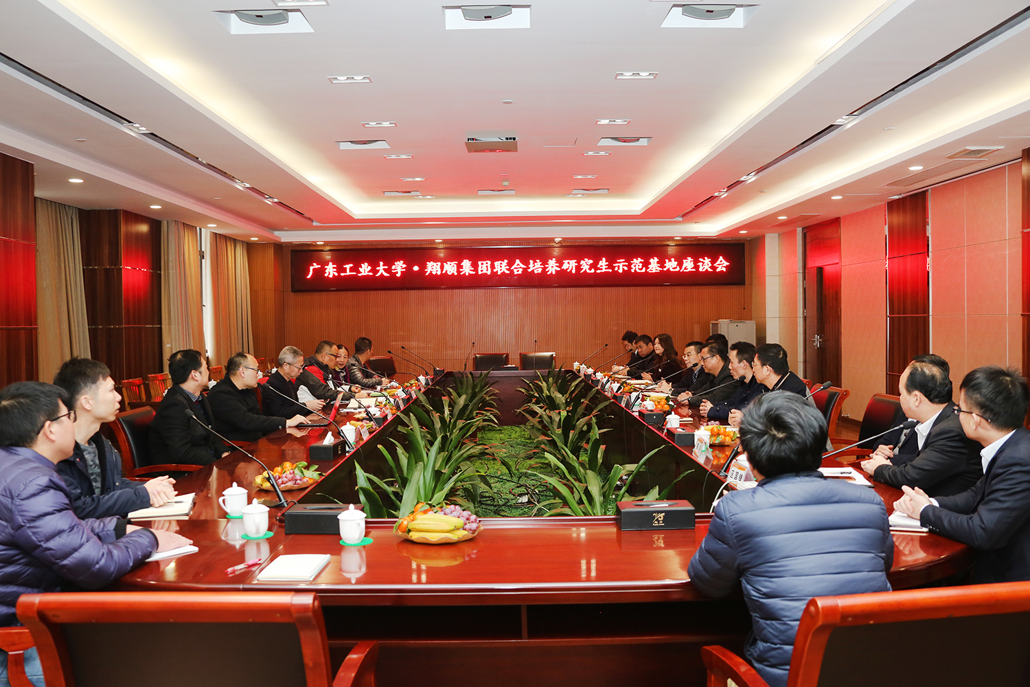 在翔顺集团总部演播厅,校企双方隆重举行了联合培养研究生示范基地签约暨揭牌仪式。翔顺集团常务副总裁钟世雄、院长刘锋代表双方致辞,介绍了企业和学院的基本情况,并希望今后双方以研究生联合培养为纽带,实现更多领域、更深层次的产学研合作,共同发展。