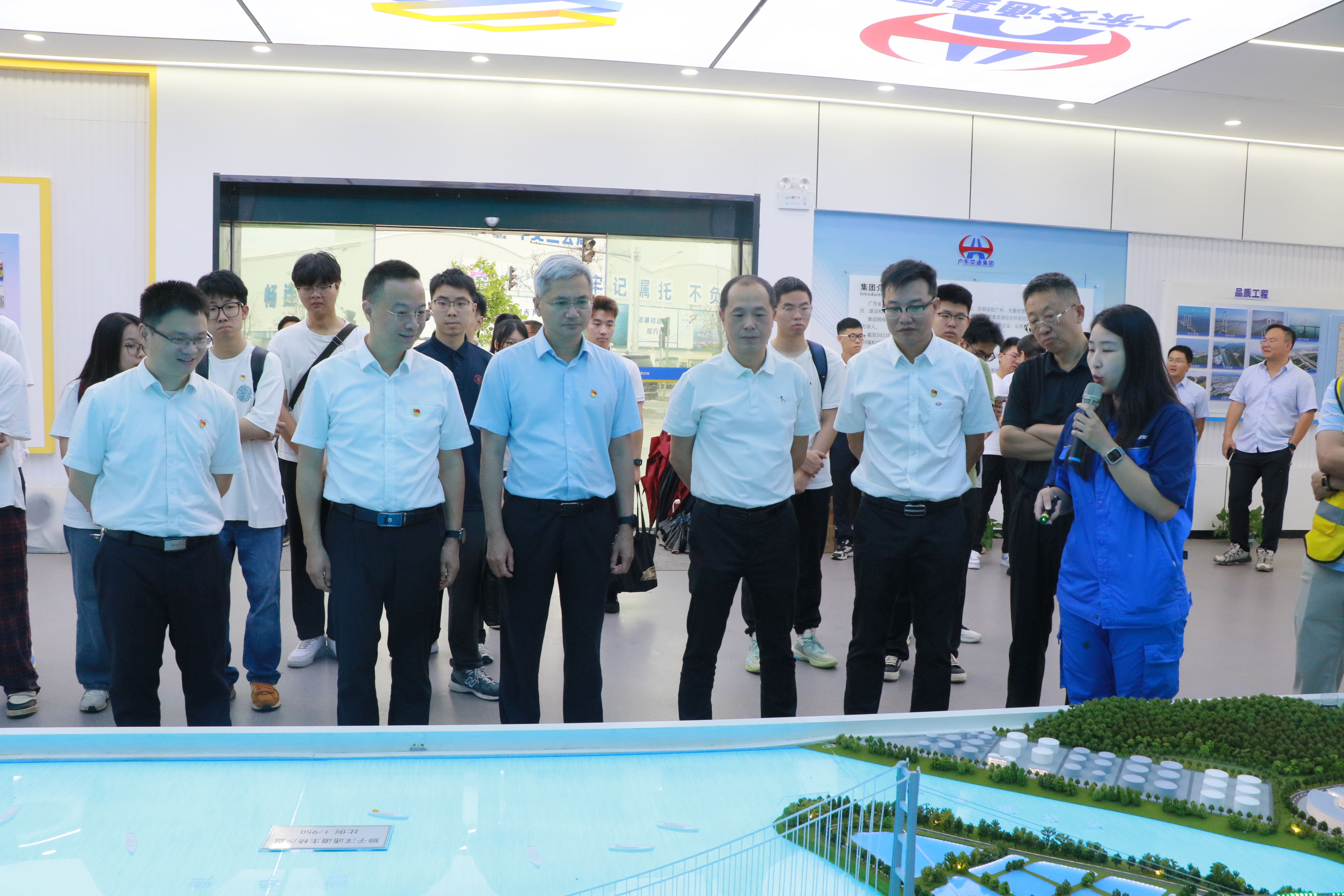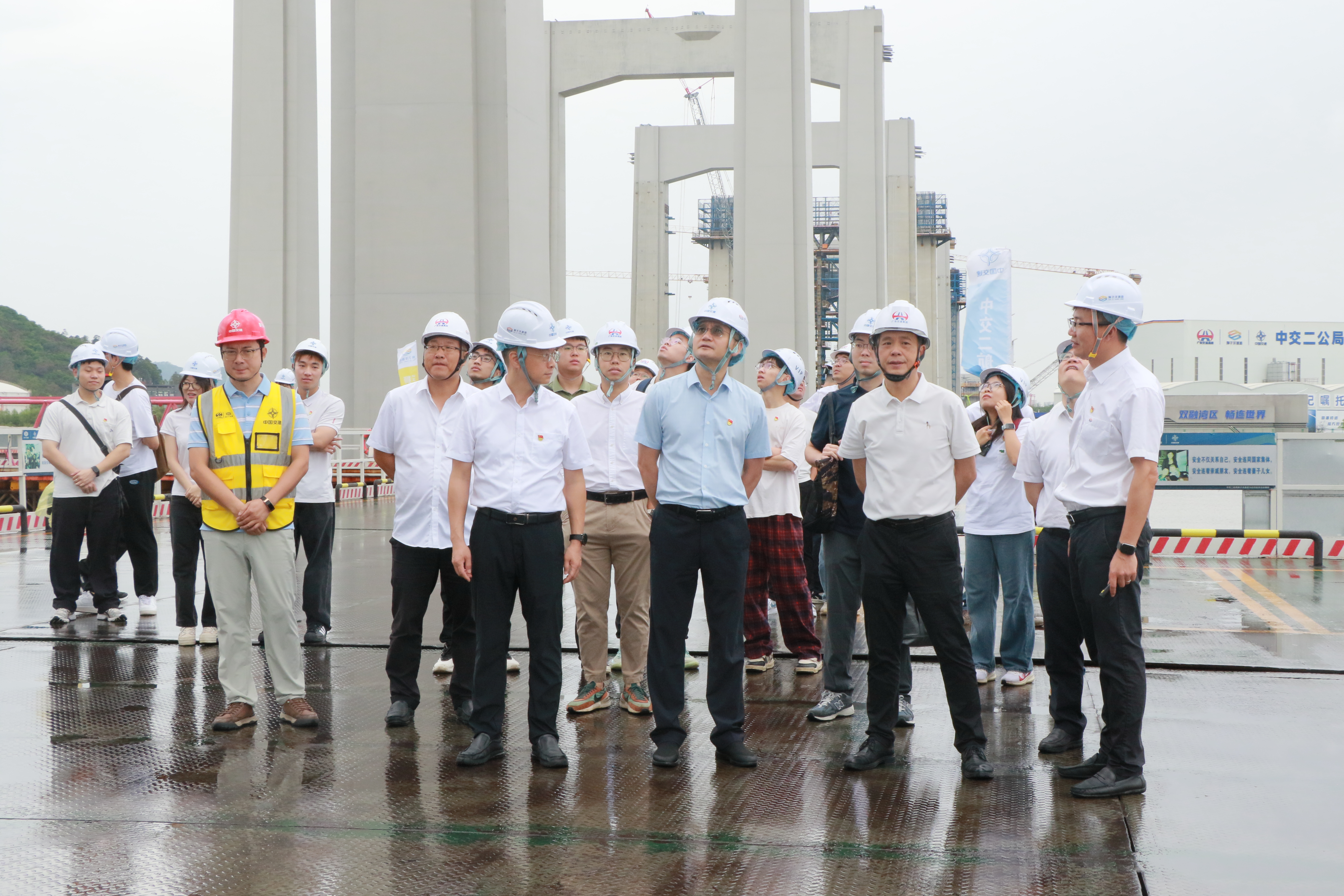 活动首站,师生实地考察项目智慧展厅及西主墩承台、锚碇基础等施工现场,相关技术人员重点介绍了项目关键控制性工程—狮子洋大桥的设计与施工技术难点、亮点等,该大桥采用双层钢桁悬索桥方案“一跨过江”,建成后将创造双层悬索桥“主跨跨径、主塔塔高、锚碇基础、主缆规模、车道数量”五项世界第一,项目总投资达481亿元。举世瞩目的超级工程令在场师生惊叹不已,激发了大家投身国家基础设施建设的使命感。