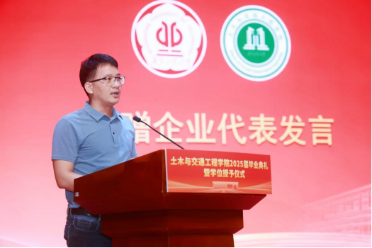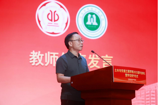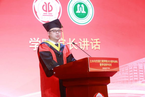 仪式在庄严国歌声中拉开帷幕。赵志伟代表学院祝贺2025届毕业生,并引领大家以“三声掌声”致敬师长、父母及支持学院发展的企业与校友。临别之际,他赠予毕业生“三把密钥”:一是勇敢启程,以务实迈出第一步;二是坚守初心,以诚信浇筑人生基座;三是开拓新路,以创新绘就时代蓝图。他寄语毕业生以专业精神立足社会,用赤子之心拥抱生活,既持奋进锐气,亦葆从容底气,祝福大家“桥架山河,路通天下”。