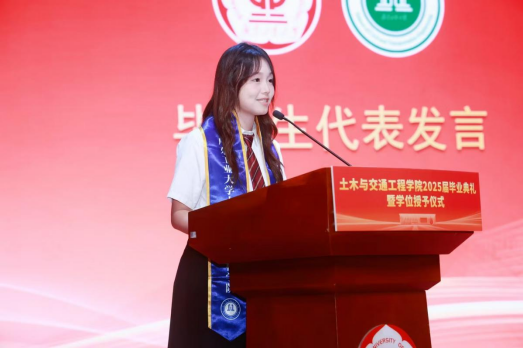 “纵然前路经纬各异,岗位千差万别,但我们身上都深深烙印着‘广工人’的印记,‘团结、勤奋、求是、创新’的校训、和‘土敦木华、交行志远’的院训精神将永远把我们紧紧相连。”曾两次获得国家奖学金的优秀毕业生代表陈卓潆感恩母校培养,号召毕业生们带着广工精神拼搏奋斗,勇担使命,为祖国和母校争光,并祝愿母校桃李满园。