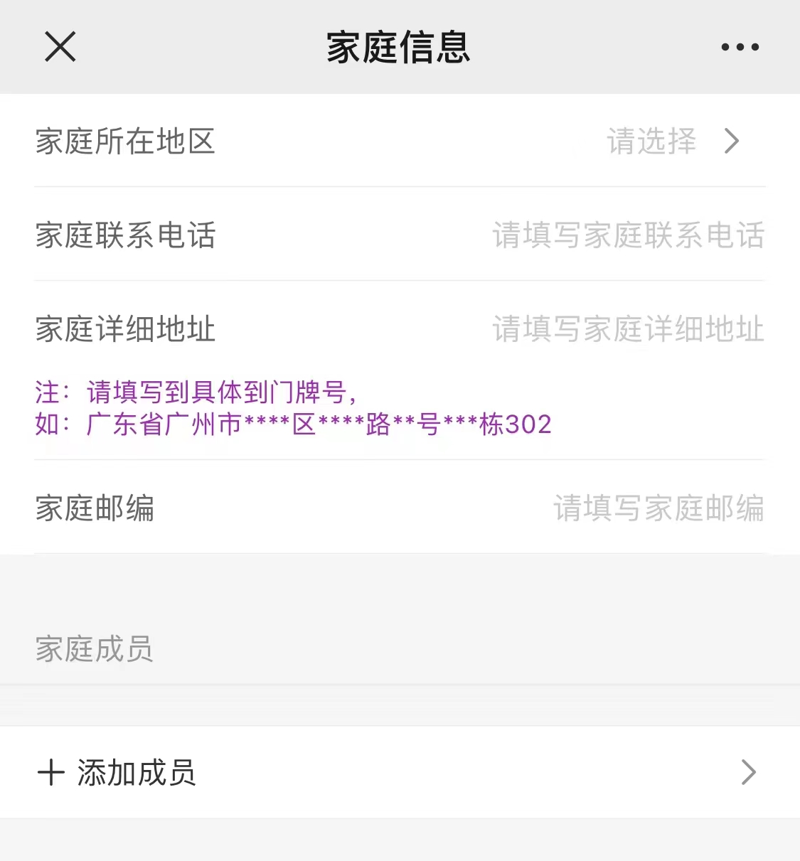 (一)完善家庭详细地址等。学生家庭信息是反映学生家庭经济情况的重要信息,请同学在【家庭信息】完善家庭联系信息,家庭详细住址务必填写完整和规范,填写格式为“省(直辖市、自治区)+市(地区、州、自治州、盟)+县(市、区、自治县、旗、自治旗)+镇(乡、街道、民族乡)+村(道路、小区、房号等)”。