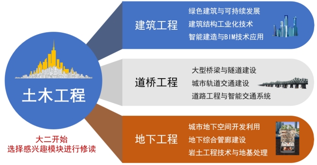 创新班模块:智慧工程测量学、土木工程材料及发展、混凝土结构设计原理、钢结构设计原理、房屋建筑学、混凝土结构设计、建筑钢结构设计、结构抗震与高层建筑结构设计、土木工程智慧施工、工程项目智慧管理